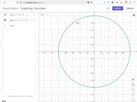 If we plot this on a flat sheet of paper it gives us a circle, passing through the points where 𝑥 = 1 or -1 and 𝑦 = 0, and the points where 𝑥 = 0 and 𝑦 = 1 or -1. Try it yourself - put 𝑥2 + 𝑦2 – 1 = 0 in the first box: https://www.desmos.com/calculator